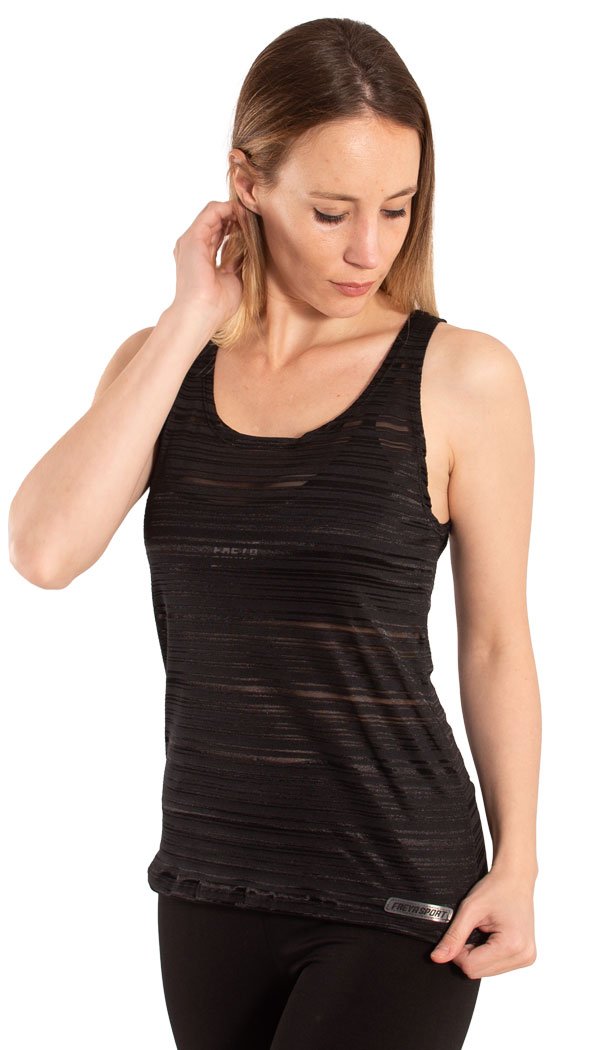 Confeccionada con tejido fantasía, Yalena es una prenda de calce y textura especiales. Se trata de una musculosa de rayas horizontales que combina líneas en tonos sólidos con otras más translúcdidas, siempre en el mismoo color. Su caída se adapta suavemente al cuerpo. ¡Sumala a tus conjuntos!