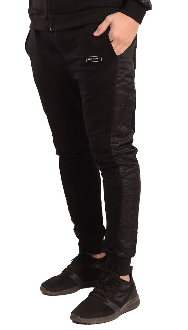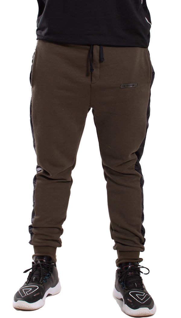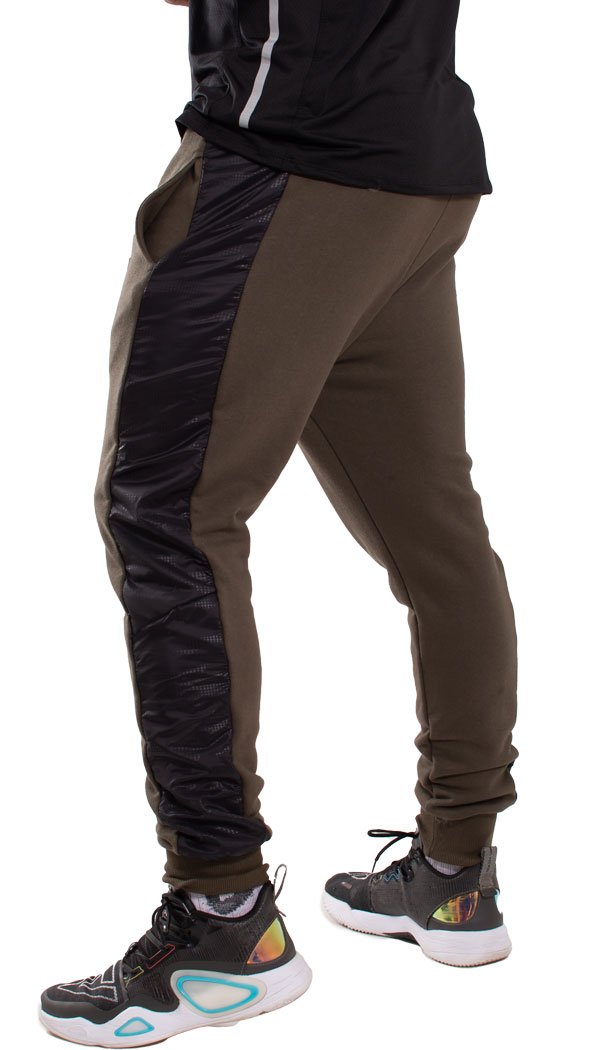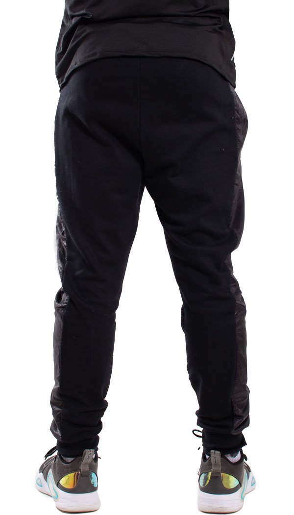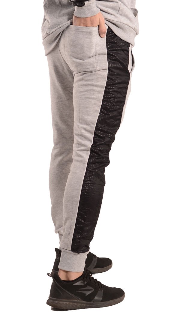 Pantalón babucha confeccionado con rústico de algodón y diseñado con recortes laterales en nylon negro print Oporto. Cintura con elástico y cordón regulable, bolsillos delanteros y bolsillo plaqué en su parte trasera. Posee un detalle de falsa cartera en el frente y puños de ribb, complemento para mejor ajuste.