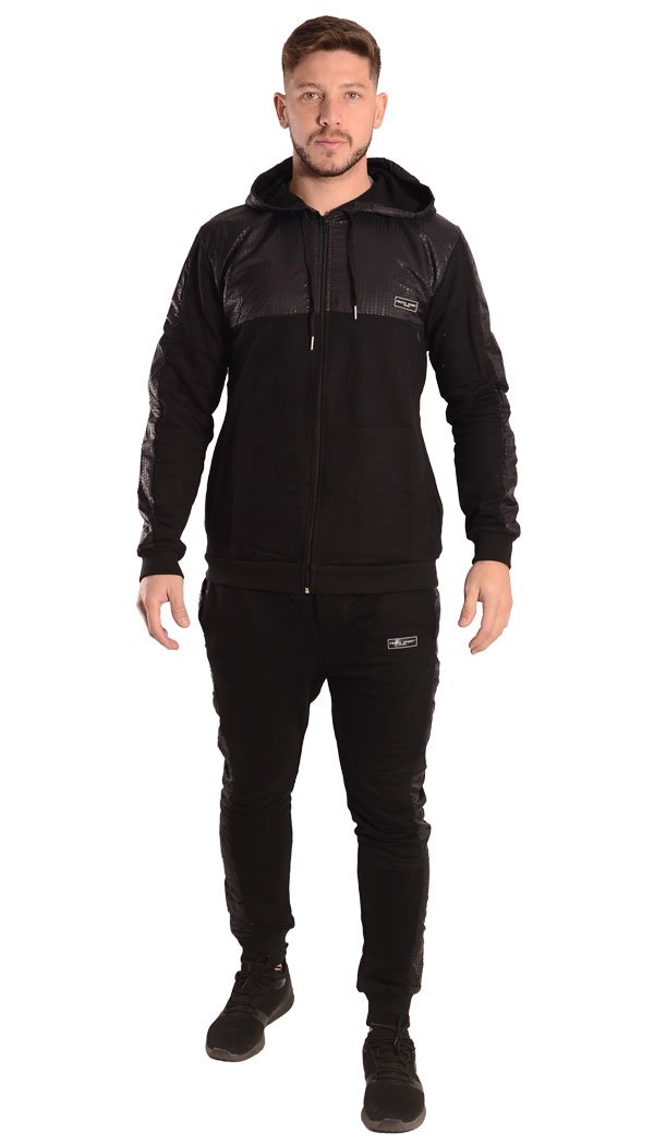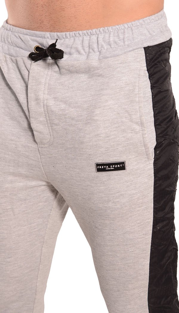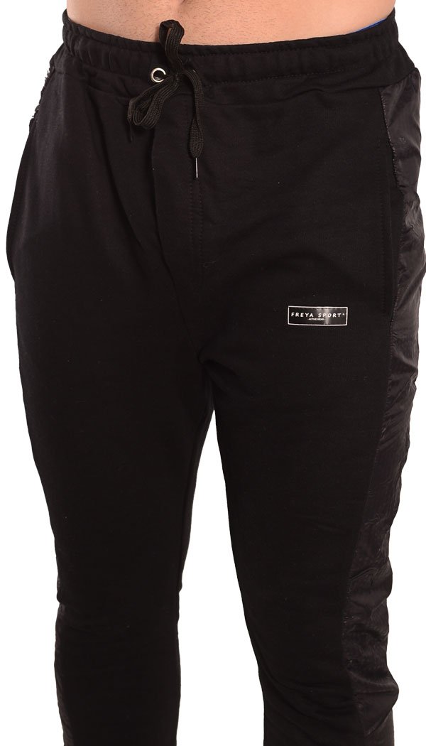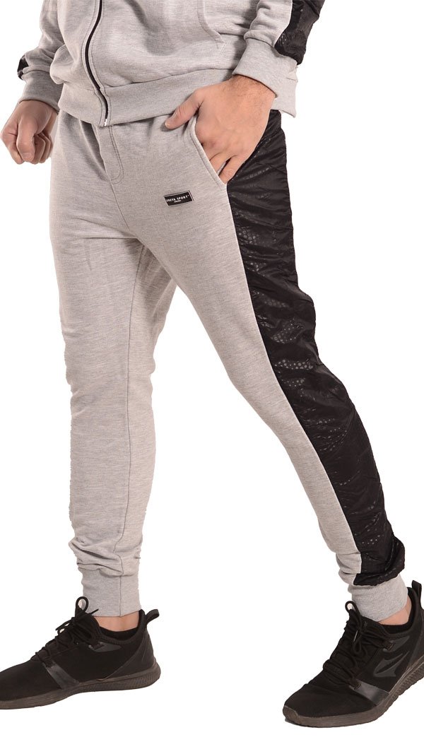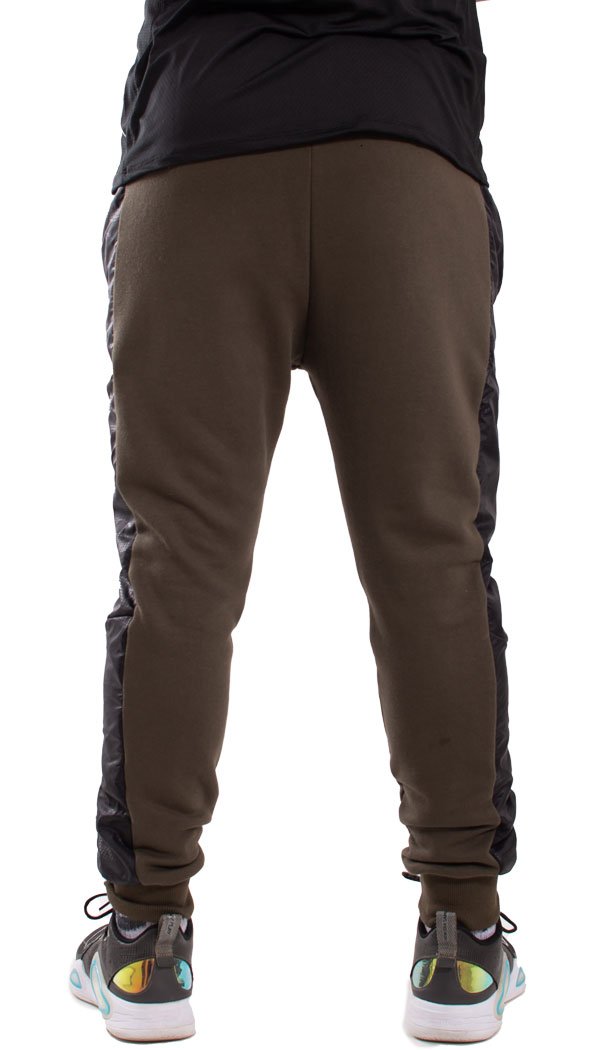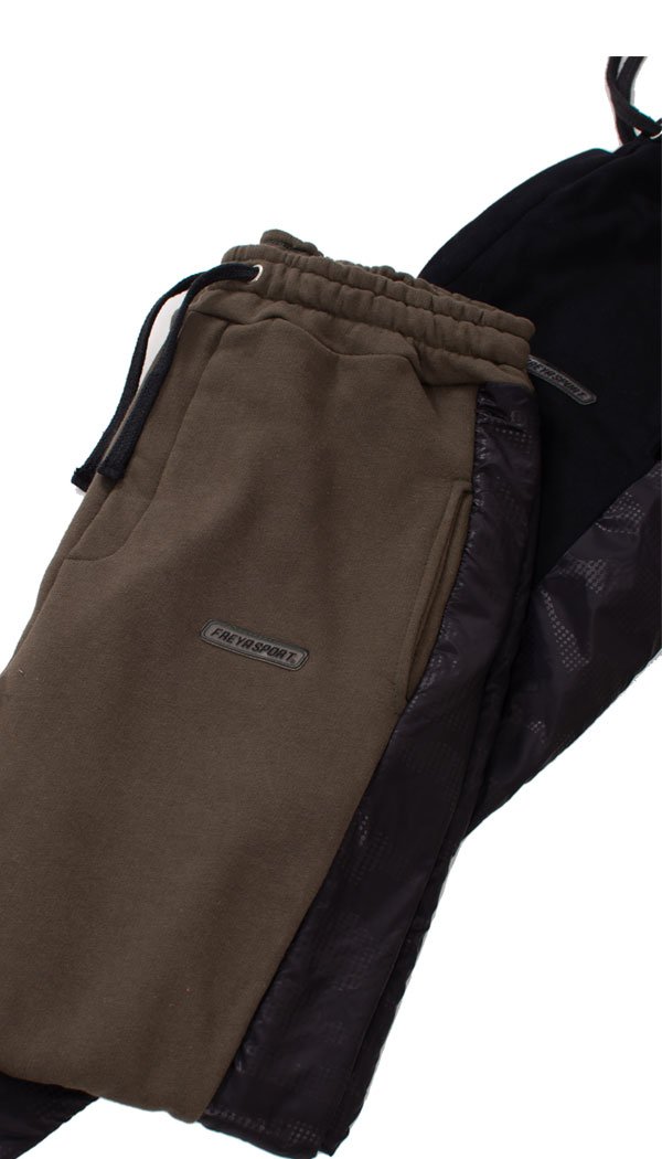 Pantalón babucha confeccionado con rústico de algodón y diseñado con recortes laterales en nylon negro print Oporto. Cintura con elástico y cordón regulable, bolsillos delanteros y bolsillo plaqué en su parte trasera. Posee un detalle de falsa cartera en el frente y puños de ribb, complemento para mejor ajuste.