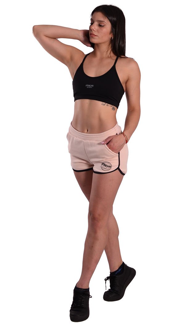 Short de tela rústica con cintura elastizada, bolsillos y detalle de estampa de diseño en el frente. Posee vivos en negro que recorren las piernas y los laterales para crear un llamativo contraste con los tonos suaves del algodón. Por su material y confección, se trata de una prenda cómoda y versátil.